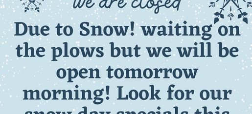 We are closed today due to awaiting the snow plows. We will be reopened tomorrow morning! Stay tuned for Snow Day Specials this week!!